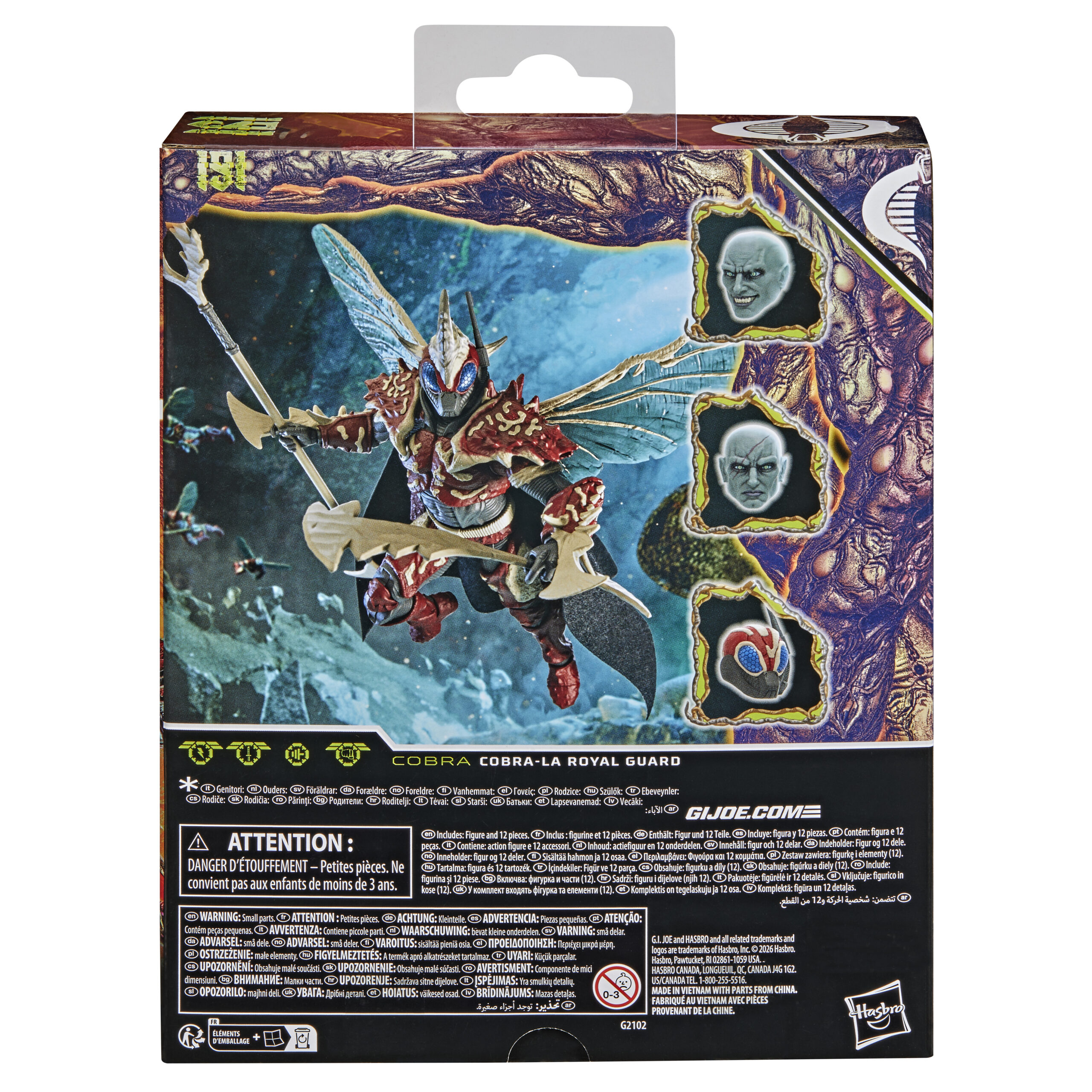 New to the G.I. JOE Classified Series line, Cobra-La Royal Guard comes ready for adventure, with multiple points of articulation for high poseability. This Cobra-La Royal Guard figure contains 12 character-inspired accessory pieces, including 2 wings, 2 helmeted and 1 unmasked alternate heads, a spear, removable shoulder armor, swapable bioorganic arm blade gauntlets, a sword, and a weapon accessory; plus a removable softgoods cape.