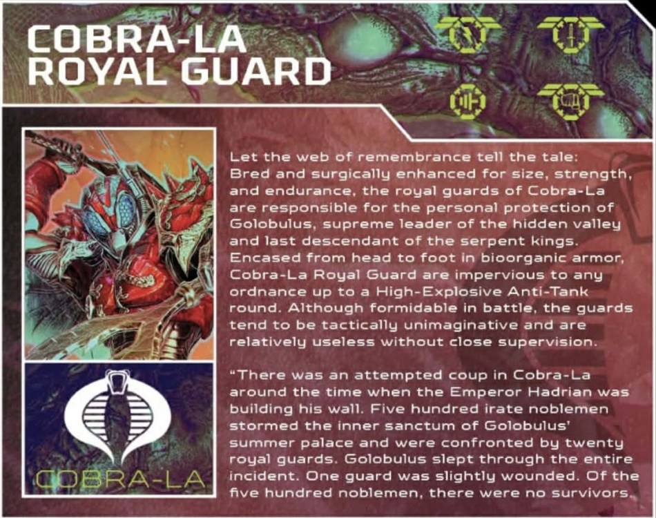 Bred and surgically enhanced for size, strength, and endurance, the royal guards of Cobra-La are responsible for the personal protection of Golobulus, supreme leader of the hidden valley and last descendant of the serpent kings. Encased from head to foot in bioorganic armor, Cobra-La Royal Guard are impervious to any ordnance up to a High-Explosive Anti-Tank round. Although formidable in battle, the guards tend to be tactically unimaginative and are relatively useless without close supervision.