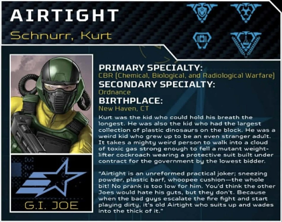“Airtight is an unreformed practical joker; sneezing powder, plastic barf, whoopee cushion—the whole bit! No prank is too low for him. You’d think the other Joes would hate his guts, but they don’t. Because when the bad guys escalate the fire fight and start playing dirty, it’s old Airtight who suits up and wades into the thick of it.”