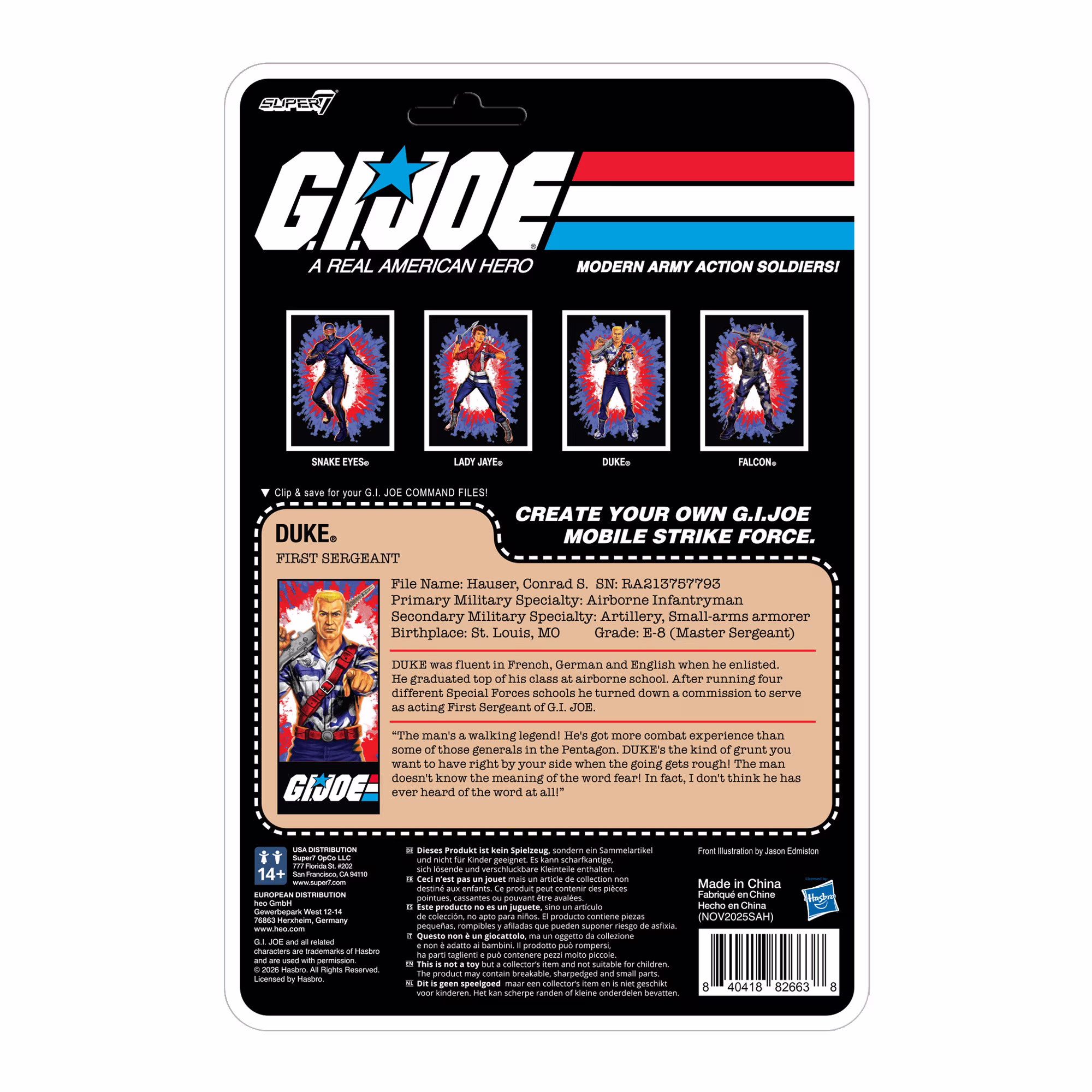 - Officially Licensed Super7 G.I. Joe Duke First Sergeant ReAction+ Collectible Figure — Hasbro Licensed; Authentic G.I. Joe character Duke (First Sergeant, File Name: Conrad S. Hauser), produced by Super7 — the leading name in retro-style ReAction collectible figures; Part of the Super7 Modern Army Action Soldiers series alongside Snake Eyes, Lady Jaye, and Falcon — collect all four to build your G.I. Joe Mobile Strike Force; Collectible backer card features original-style G.I. Joe branding, character file card, G.I. Joe star medallion, and full series artwork with front illustration by Jason Edmiston;