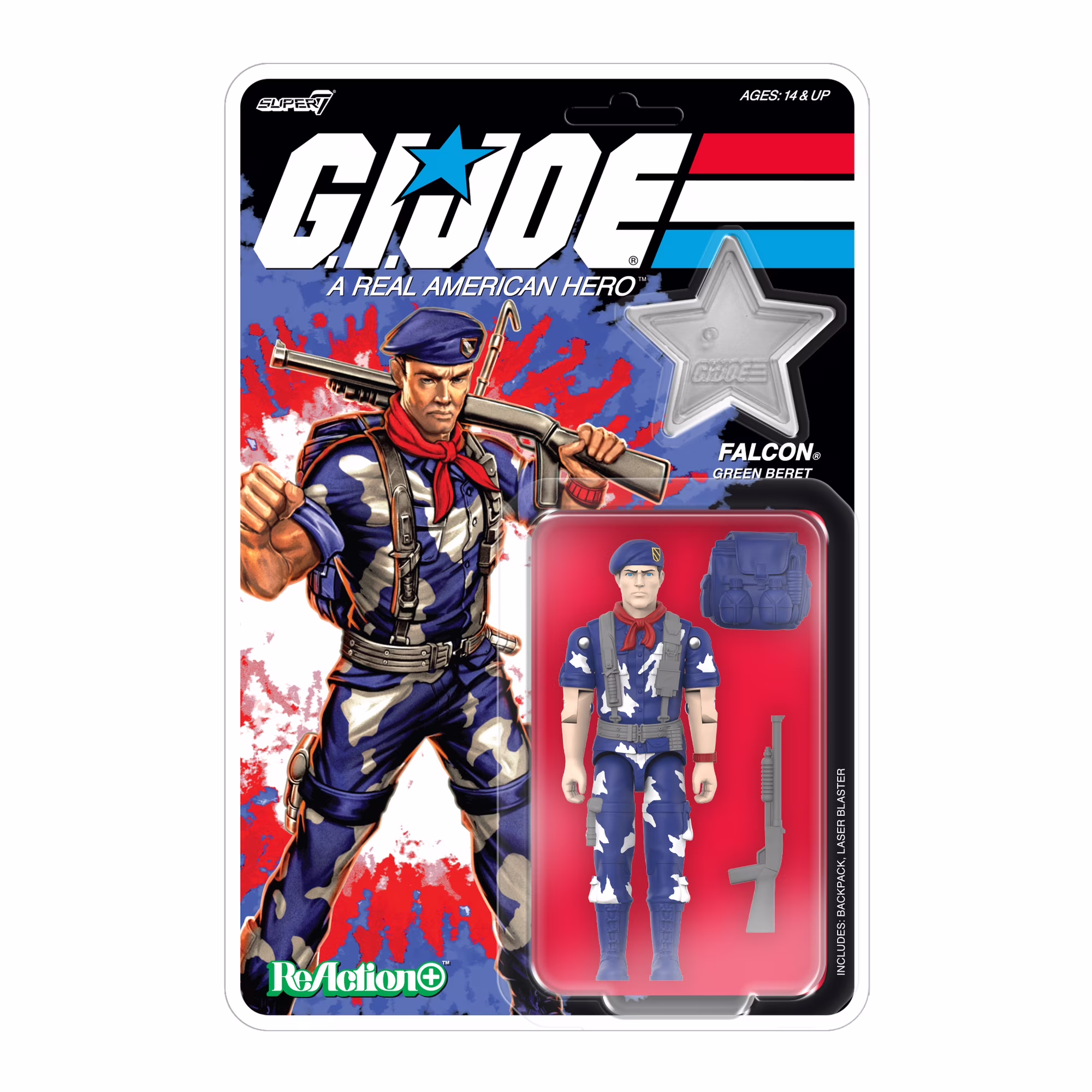 - Super7 G.I. Joe Falcon Green Beret officially licensed ReAction+ collectible figure — 3.75-inch retro-style figure with backpack and laser blaster accessories — part of the Modern Army Action Soldiers series — display-ready backer card with character file card — Ages 14 and up, collector’s item only
