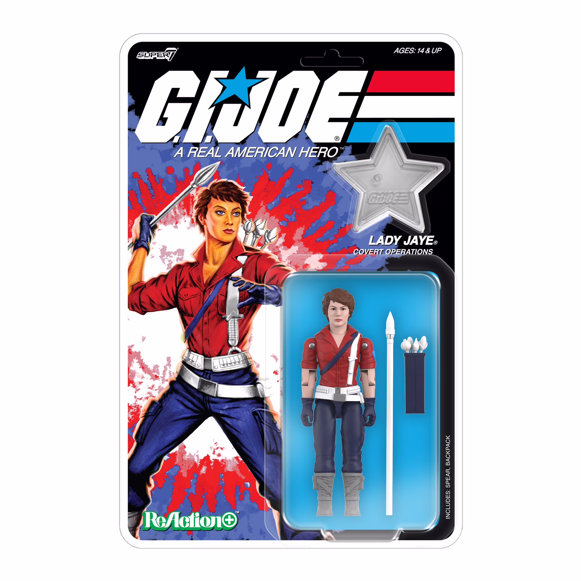 - Super7 G.I. Joe Lady Jaye Covert Operations officially licensed ReAction+ collectible figure — 3.75-inch retro-style figure with spear and backpack accessories — part of the Modern Army Action Soldiers series — display-ready backer card with character file card and G.I. Joe star medallion — Ages 14 and up, collector’s item only