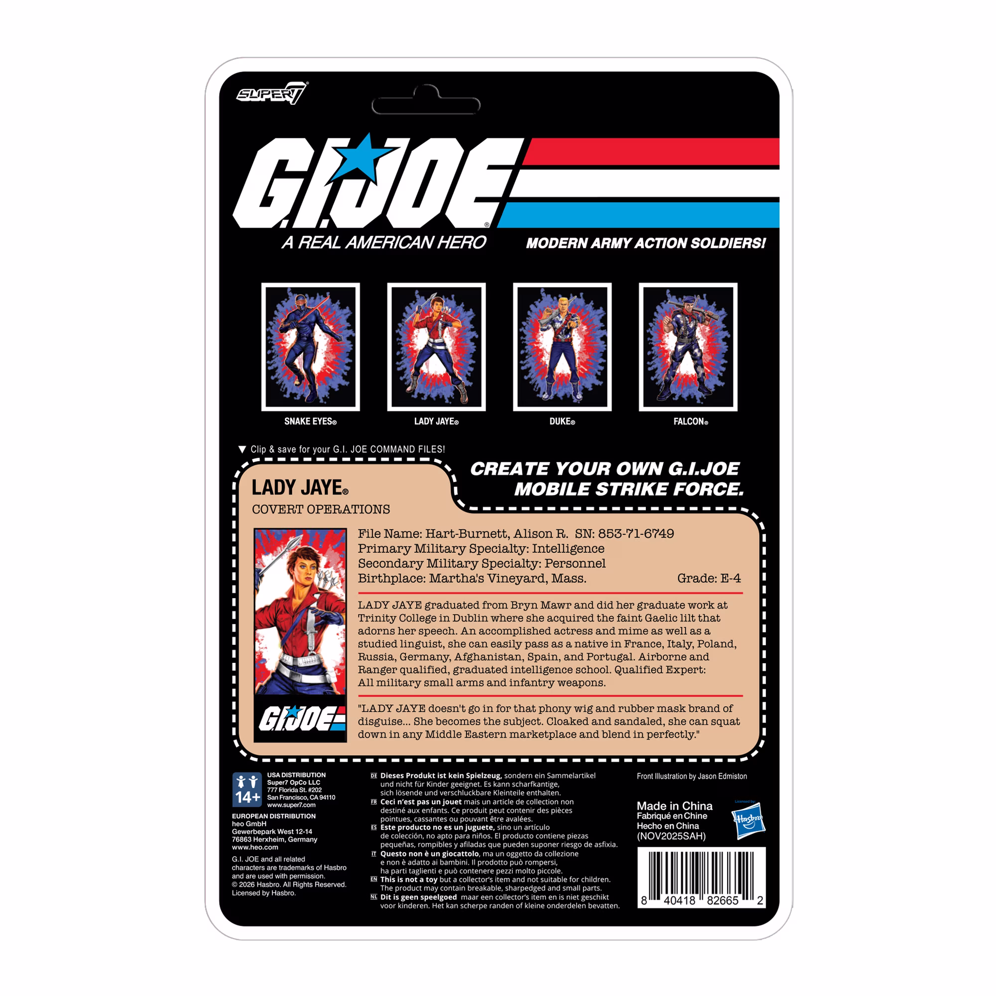 - Officially Licensed Super7 G.I. Joe Lady Jaye Covert Operations ReAction+ Collectible Figure — Hasbro Licensed; Authentic G.I. Joe character Lady Jaye (Covert Operations, File Name: Alison R. Hart-Burnett), produced by Super7 — the leading name in retro-style ReAction collectible figures; Part of the Super7 Modern Army Action Soldiers series alongside Snake Eyes, Duke, and Falcon — collect all four to build your G.I. Joe Mobile Strike Force; Collectible backer card features original-style G.I. Joe branding, character file card, G.I. Joe star medallion, and full series artwork with front illustration by Jason Edmiston;