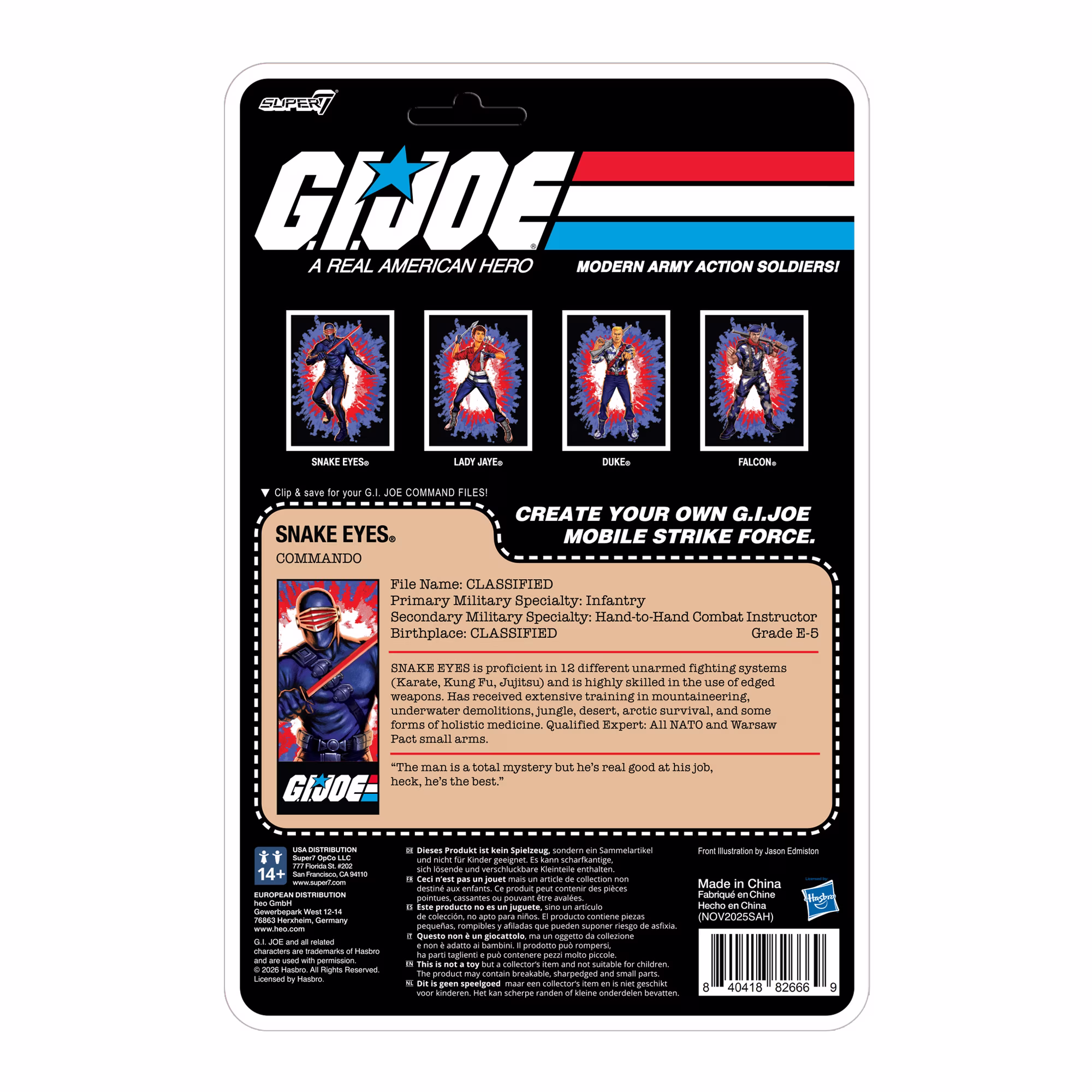 - Officially Licensed Super7 G.I. Joe Snake Eyes Commando ReAction+ Collectible Figure — Hasbro Licensed; Authentic G.I. Joe character Snake Eyes (Commando, File Name: CLASSIFIED) — one of the most iconic and sought-after characters in G.I. Joe history — produced by Super7, the leading name in retro-style ReAction collectible figures; Part of the Super7 Modern Army Action Soldiers series alongside Lady Jaye, Duke, and Falcon — collect all four to build your G.I. Joe Mobile Strike Force; Collectible backer card features original-style G.I. Joe branding, character file card, G.I. Joe star medallion, and full series artwork with front illustration by Jason Edmiston;